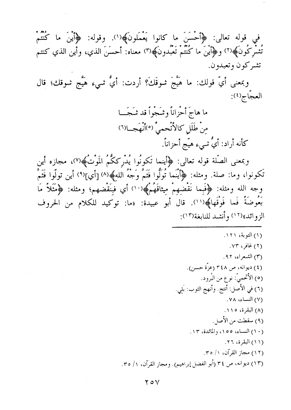 في قوله تعالى: {أَحْسَنَ مَا كَانُوا يَعْمَلُونَ}. وقوله: {أَيْنَ مَا كُنْتُمْ تُشْرِكُونَ} و {أَيْنَ مَا كُنْتُمْ تَعْبُدُونَ} معناه: أحسن الذي، وأين الذي كنتم تشركون وتعبدون.