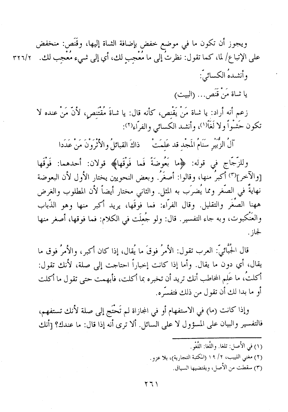 قال الجُبَّائي: العرب تقول: الأمر فوق ما يقال، إذا كان أكبر، والأمر فوق ما يقال، أي دون ما يقال. وأما إذا كانت إخباراً احتاجت إلى صلة، لأنك تقول: أكلت، ما علم المخاطب أنك تريد أن تخبره بما أكلت، فأبهمت حتى تقول ما أكلت أو ما بدا لك أن تقول من ذلك فتفسره.