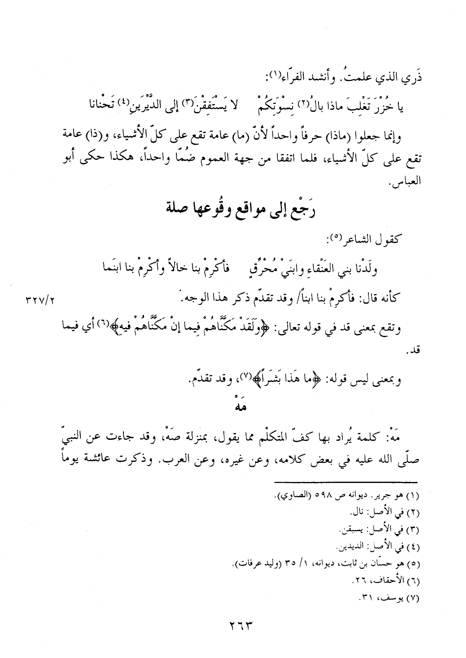 وإنما جعلوا (ماذا) حرفاً واحداً لأن (ما) عامة تقع على كل الأشياء، و (ذا) عامة تقع على كل الأشياء، فلما اتفقا من جهة العموم ضمّا واحداً، هكذا حكى أبو العباس.