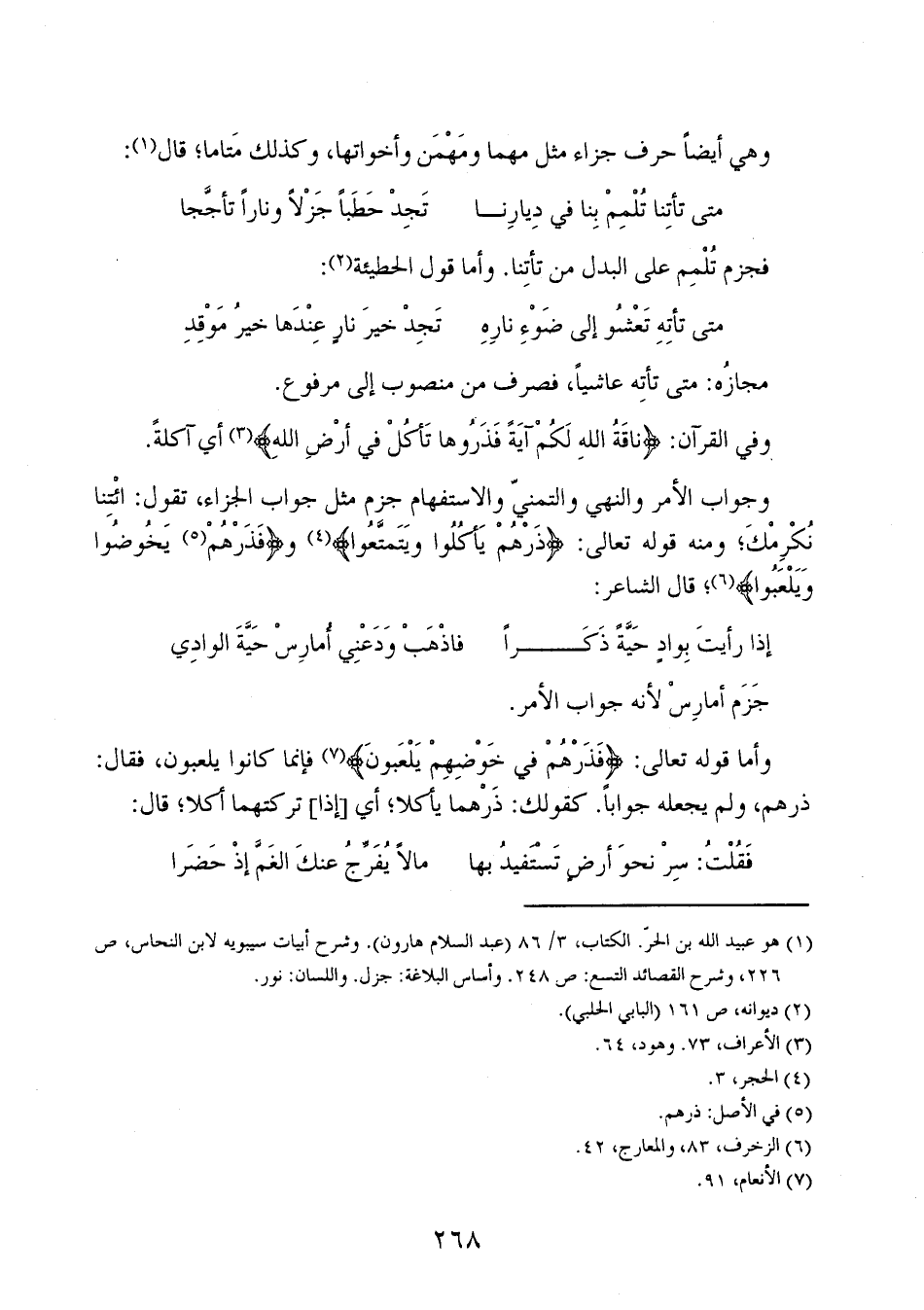 وأما قوله تعالى: {ذَرْهُمْ فِي خَوْضِهِمْ يَلْعَبُونَ} فإنما كانوا يلعبون، فقال: ذرهم، ولم يجعله جواباً. كقولك: ذرهما يأكلا؛ أي [إذا] تركتهما أكلا؛ قال: