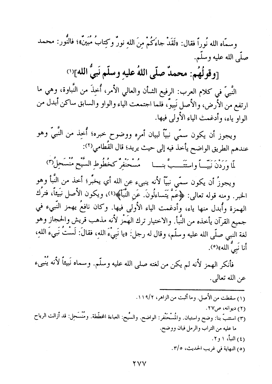 وسماه الله نوراً فقال: "لقد جاءكم من الله نور وكتاب مبين"؛ فالنور: محمد صلى الله عليه وسلم.
