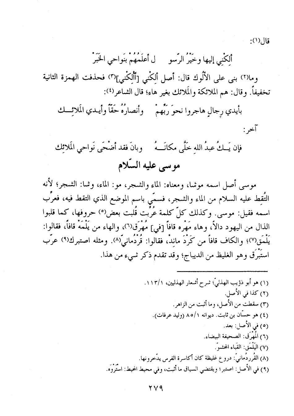 موسى أصل اسمه موشا، ومعناه: الماء والشجر، مو: الماء، وشا: الشجر؛ لأنه التُقِط عليه السلام من الماء والشجر، فسمي باسم الموضع الذي التقط فيه، فعرِّب اسمه فقيل: موسى. وكذلك كل كلمة عرِّبت قُلبت بعض حروفها، كما قلبوا الذال من اليهود دالاً، وهاء مهره قافاً [في] مهرق، والهاء من يلمه قافاً، فقالوا: يلمق؛ والكاف قافاً من كرد ماند، فقالوا: قردُماني. ومثله اصتبرك عرّب استبرق وهو الغليظ من الديباج؛ وقد تقدم ذكر شيء من هذا.