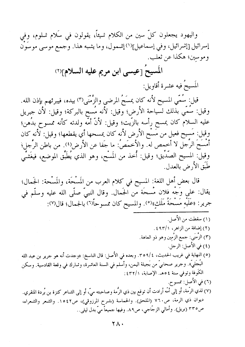 قال بعض أهل اللغة: المسيح في كلام العرب من المسحة، والمسحة: الجمال؛ يقال: على وجه فلان مسحة من الجمال. وقال النبي صلى الله عليه وسلم في جرير: "عَلَيه مسحة ملك". والمسيح كان ممسوحاً بالجمال؛ قال: