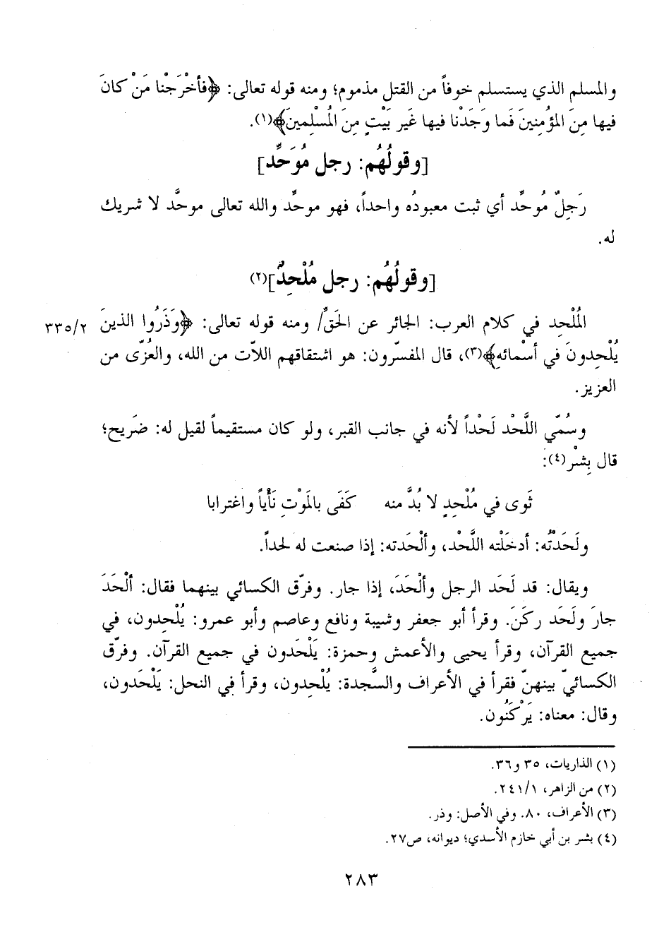 الملحد في كلام العرب: الجائر عن الحق ومنه قوله تعالى: {وَذَرُوا الَّذِينَ يُلْحِدُونَ فِي أَسْمَائِهِ}، قال المفسرون: هو اشتقاقهم اللات من الله، والعُزّى من العزيز.
