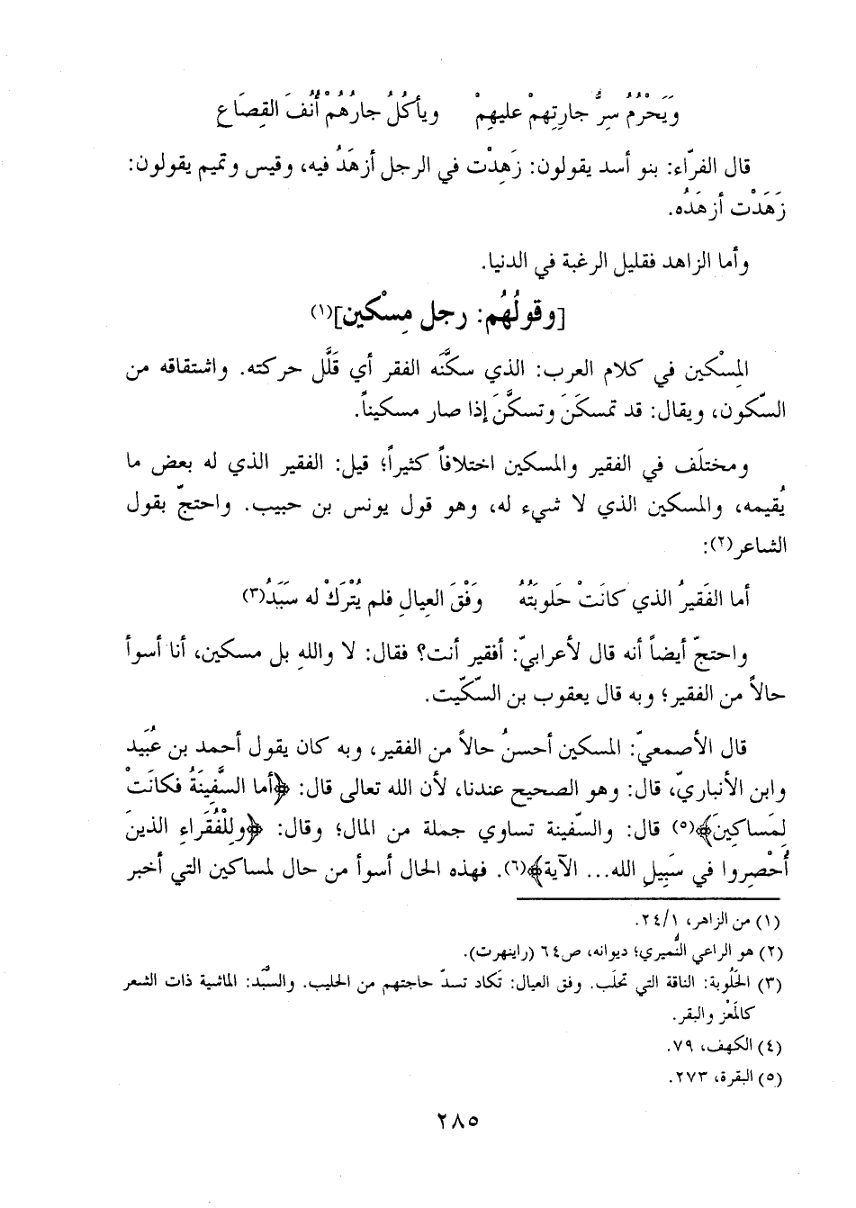 ومختلف في الفقير والمسكين اختلافاً كثيراً؛ قيل: الفقير الذي له بعض ما يقيمه، والمسكين الذي لا شيء له، وهو قول يونس بن حبيب. واحتج بقول الشاعر: