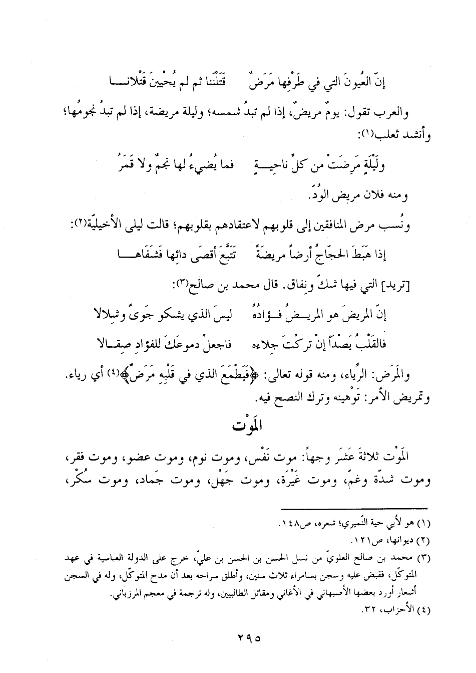 والمرض: الرياء، ومنه قوله تعالى: {فَيَطْمَعَ الَّذِي فِي قَلْبِهِ مَرَضٌ} أي رياء. وتمريض الأمر: توهينه وترك النصح فيه.