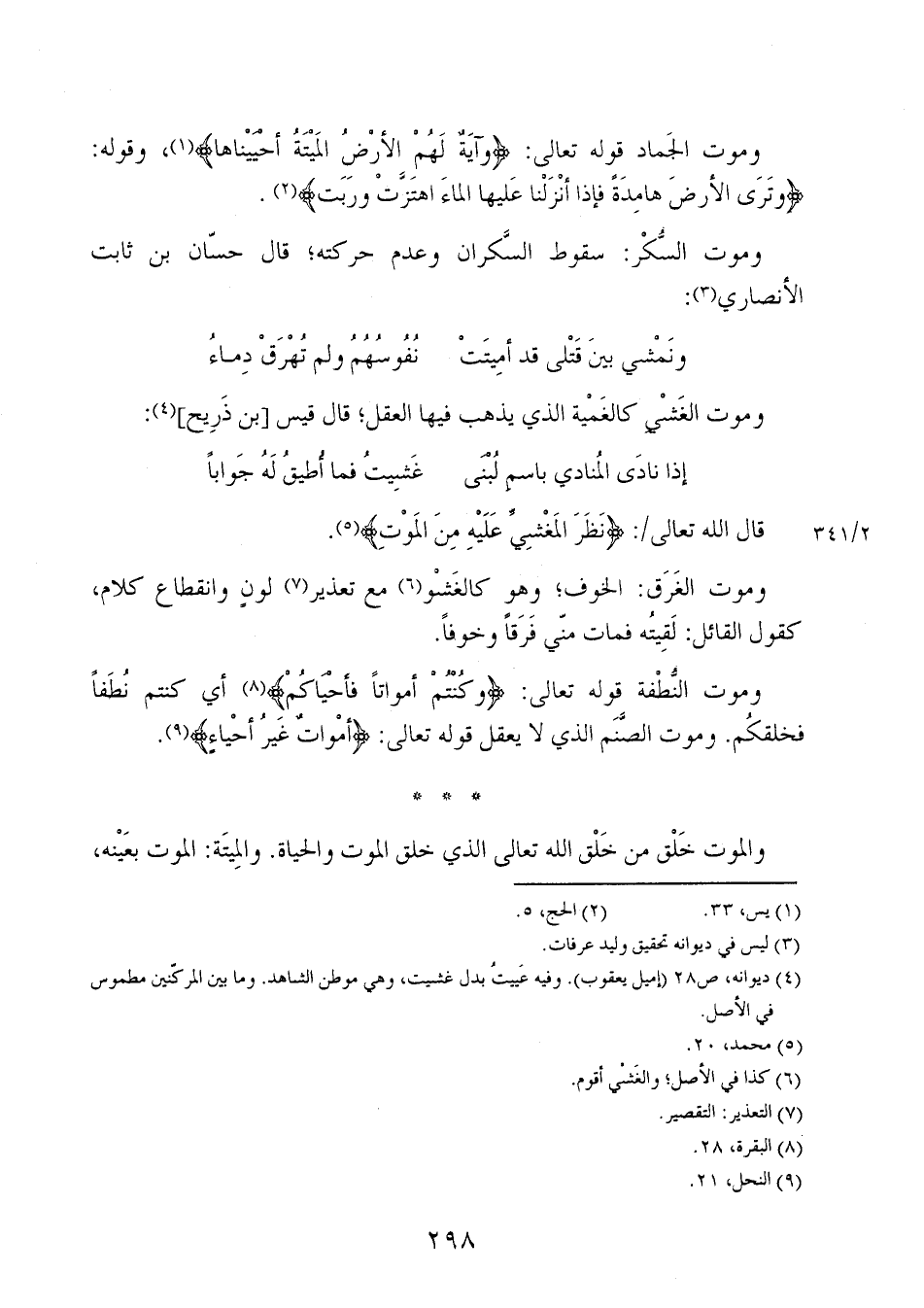 وموت الجماد قوله تعالى: {وَآيَةٌ لَهُمْ الأَرْضُ الْمَيْتَةُ أَحْيَيْنَاهَا}، وقوله: {وَتَرَى الأَرْضَ هَامِدَةً فَإِذَا أَنزَلْنَا عَلَيْهَا الْمَاءَ اهْتَزَّتْ وَرَبَتْ}.