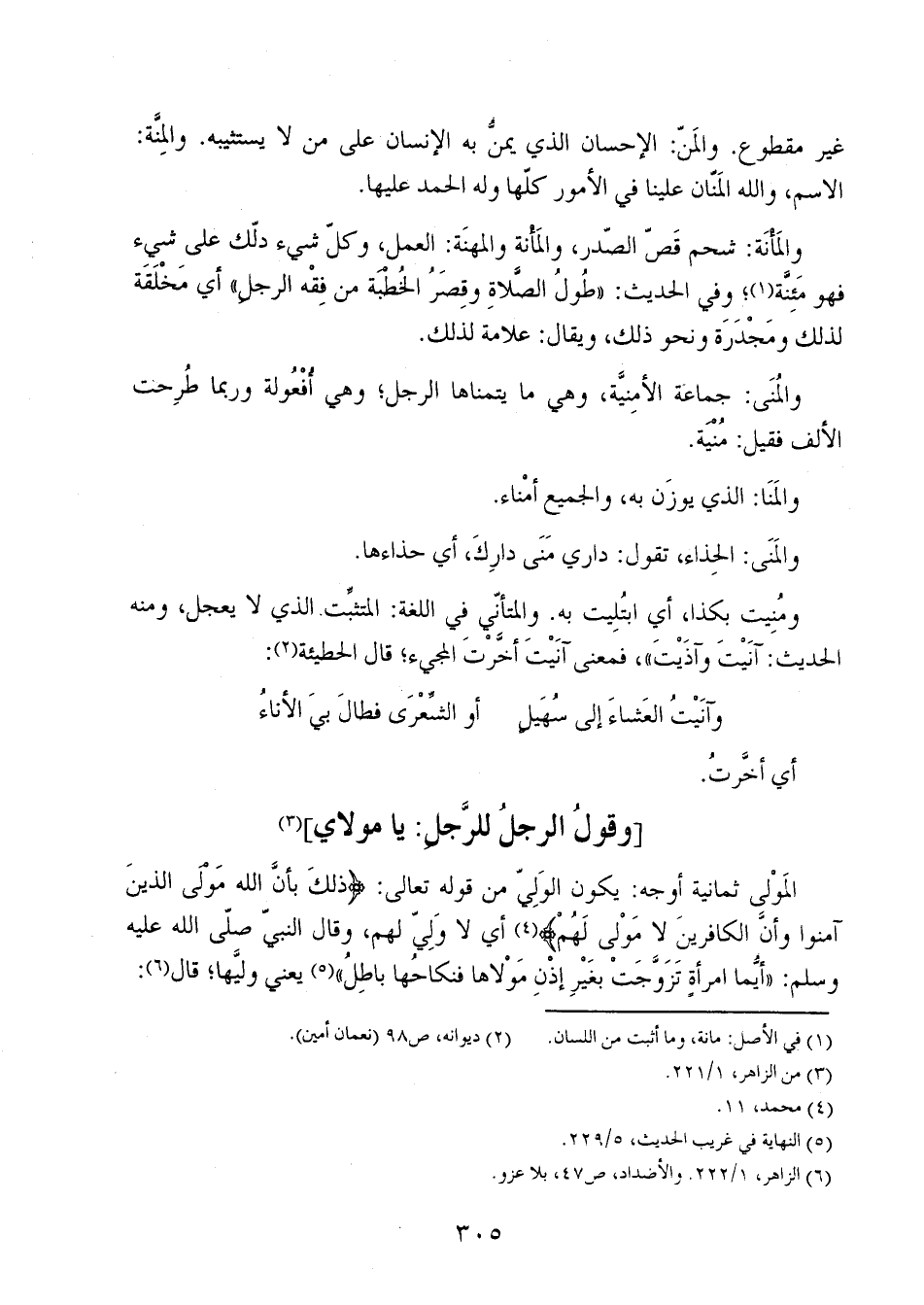 ومنيت بكذا، أي ابتُليت به. والمتأني في اللغة: المتثبت الذي لا يعجل، ومنه الحديث: آنيت وآذيت"، فمعنى آنيت أخَّرت المجيء؛ قال الحطيئة: