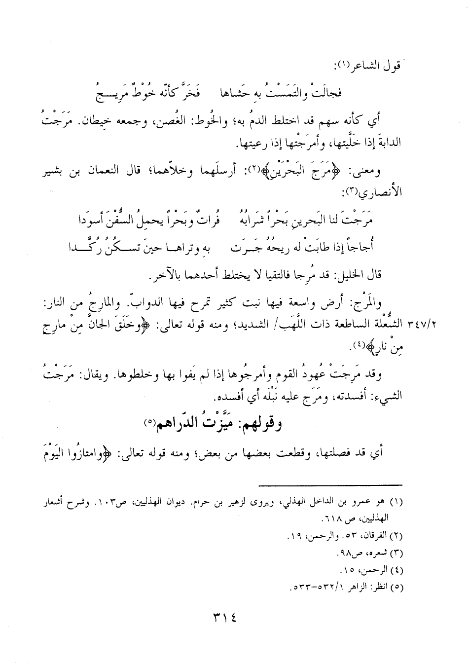 والمرج: أرض واسعة فيها نبت كثير تمرح فيها الدواب. والمارج من النار: الشعلة الساطعة ذات اللهب الشديد؛ ومنه قوله تعالى: {وَخَلَقَ الْجَانَّ مِنْ مَارِجٍ مِنْ نَارٍ}.
