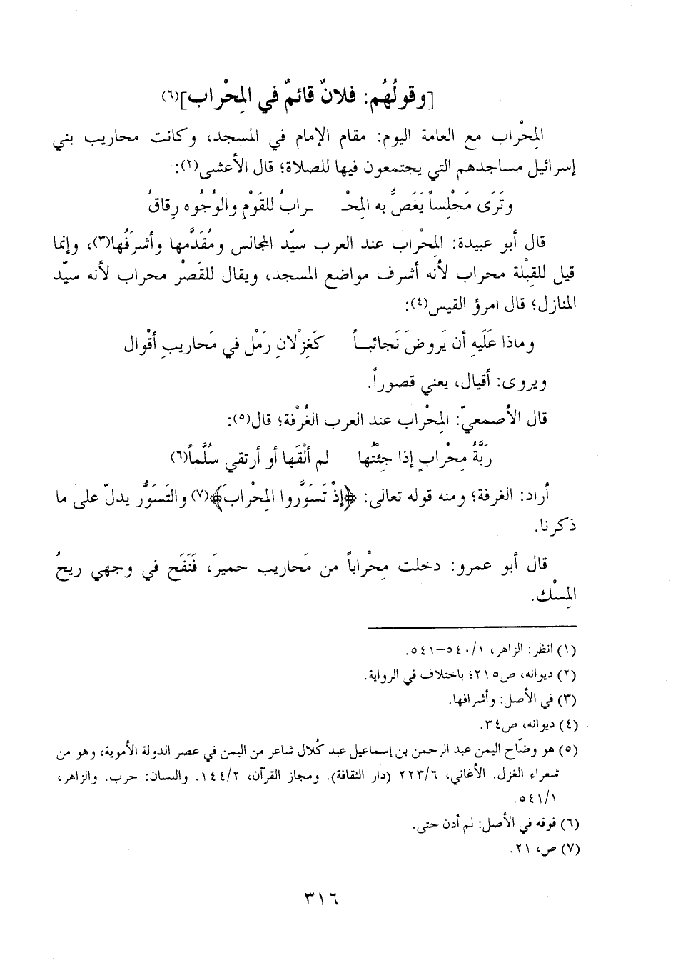 قال أبو عبيدة: المحراب عند العرب سيد المجالس ومقدَّمها وأشرفها، وإنما قيل للقِبْلة محراب لأنه أشرف مواضع المسجد، ويقال للقصر محراب لأنه سيد المنازل؛ قال امرؤ القيس: