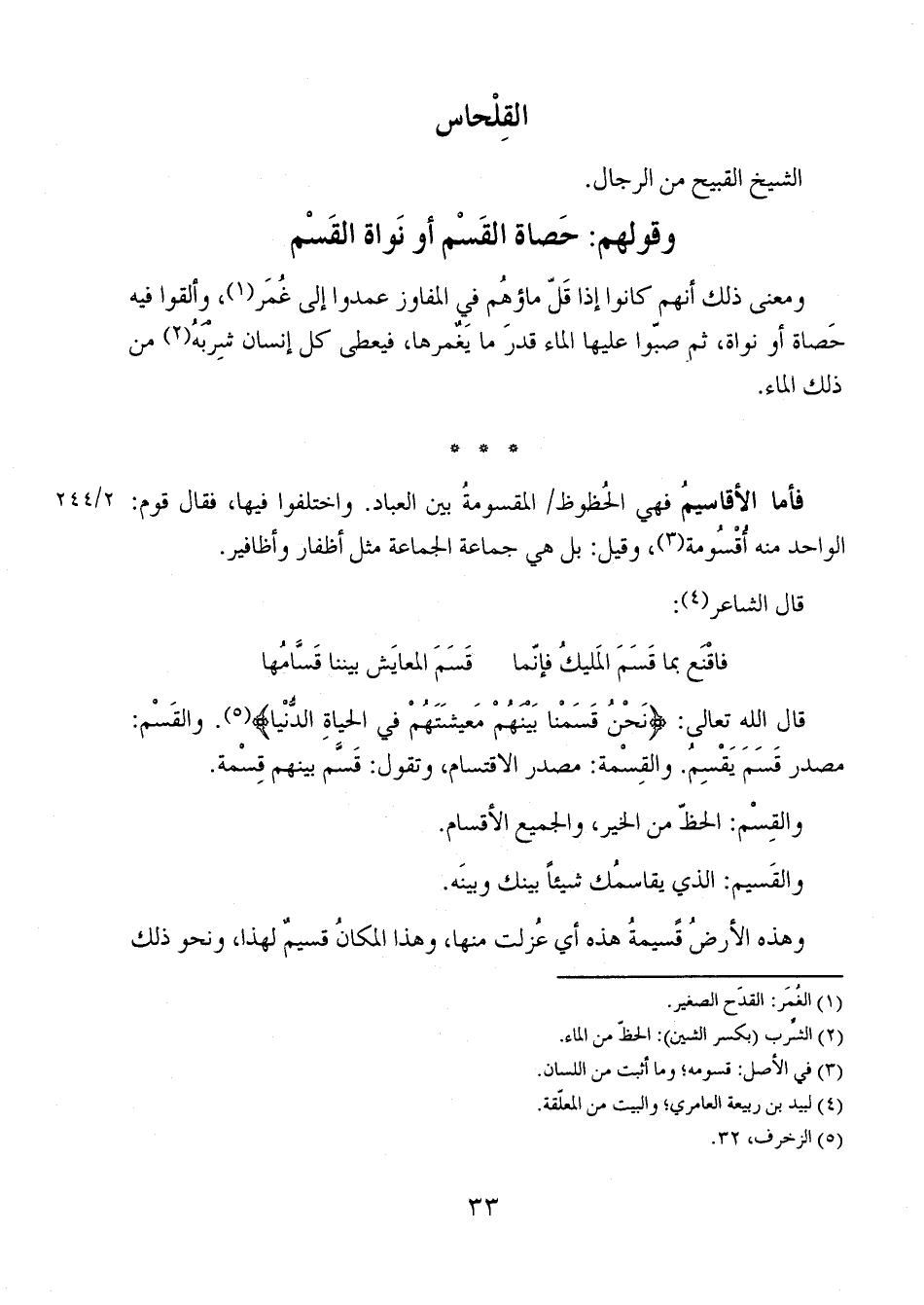 قال الله تعالى: {نَحْنُ قَسَمْنَا بَيْنَهُمْ مَعِيشَتَهُمْ فِي الْحَيَاةِ الدُّنْيَا}. والقسم: مصدر قسم يقسم. والقسمة: مصدر الاقتسام، وتقول: قسَّم بينهم قسمة.