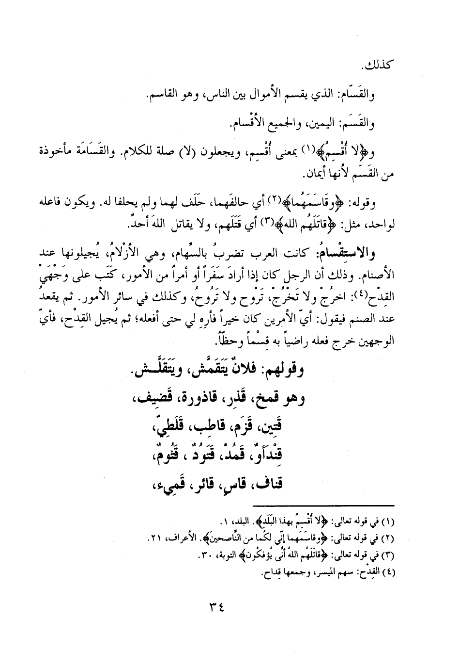 والاستقسام: كانت العرب تضرب بالسهام، وهي الأزلام، يجيلونها عند الأصنام. وذلك أن الرجل كان إذا أراد سفراً أو أمراً من الأمور، كتب على وجهي القدح: اخرج ولا تخرج، ترْوح ولا ترُوح، وكذلك في سائر الأمور. ثم يقعد عند الصنم فيقول: أي الأمرين كان خيراً فأره لي حتى أفعله؛ ثم يجيل القدح، فأي الوجهين خرج فعله راضياً به قسماً وحظاً.