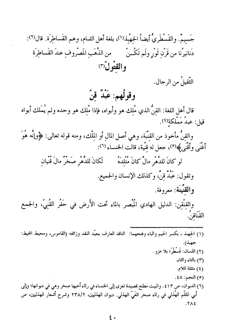 والقِنُّ مأخوذ من القنبة، وهي أصل المال أو المِلْك، ومنه قوله تعالى: {وَأَنَّهُ هُوَ أَغْنَى وَأَقْنَى}، جعل له قنية، قالت الخنساء: