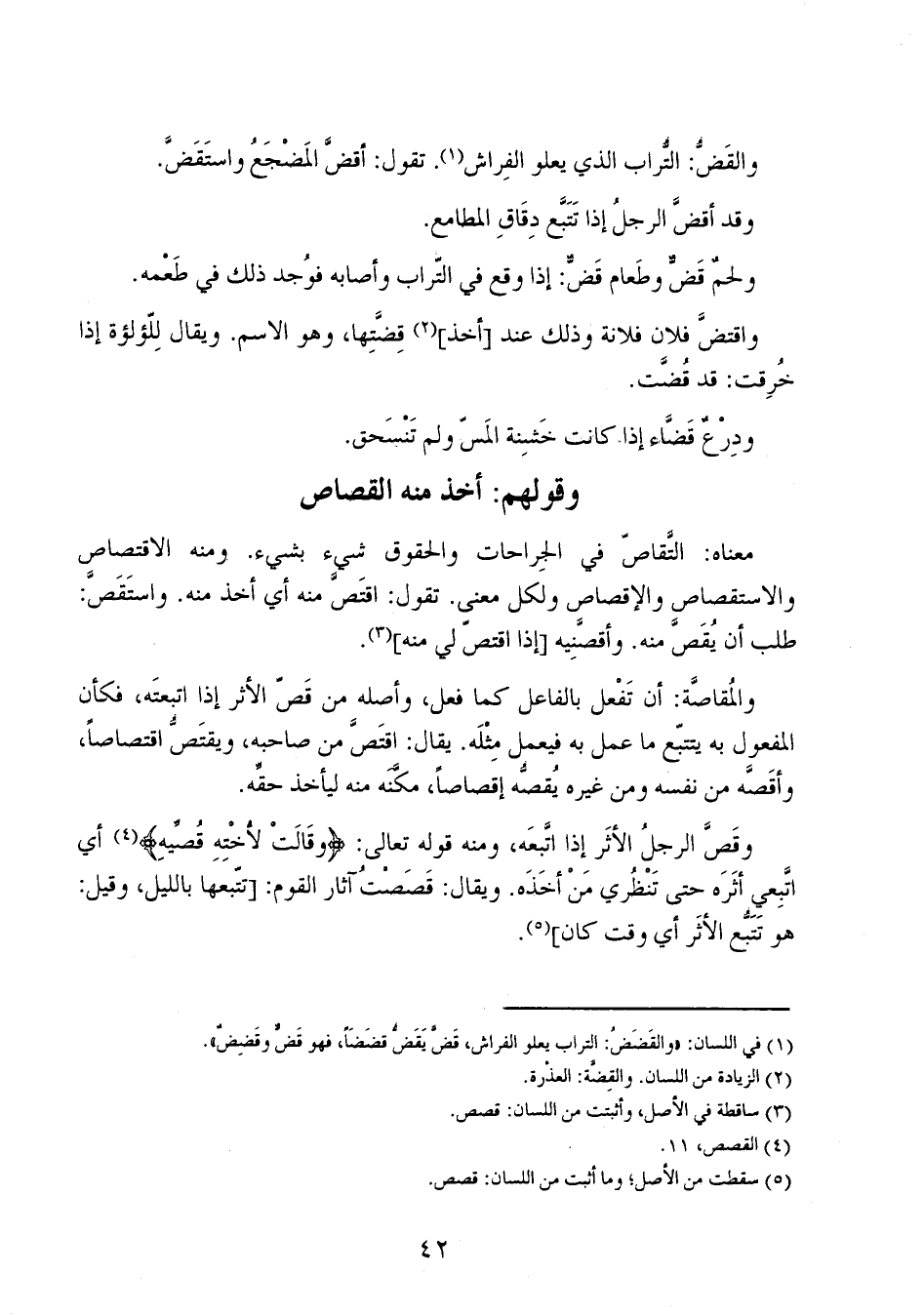 معناه: التقاص في الجراحات والحقوق شيء بشيء. ومنه الاقتصاص والاستقصاص والإقصاص ولكل معنى. تقول: اقتص منه أي أخذ منه. واستقص: طلب أن يقصَّ منه. وأقصَّنيه [إذا اقتص لي منه].