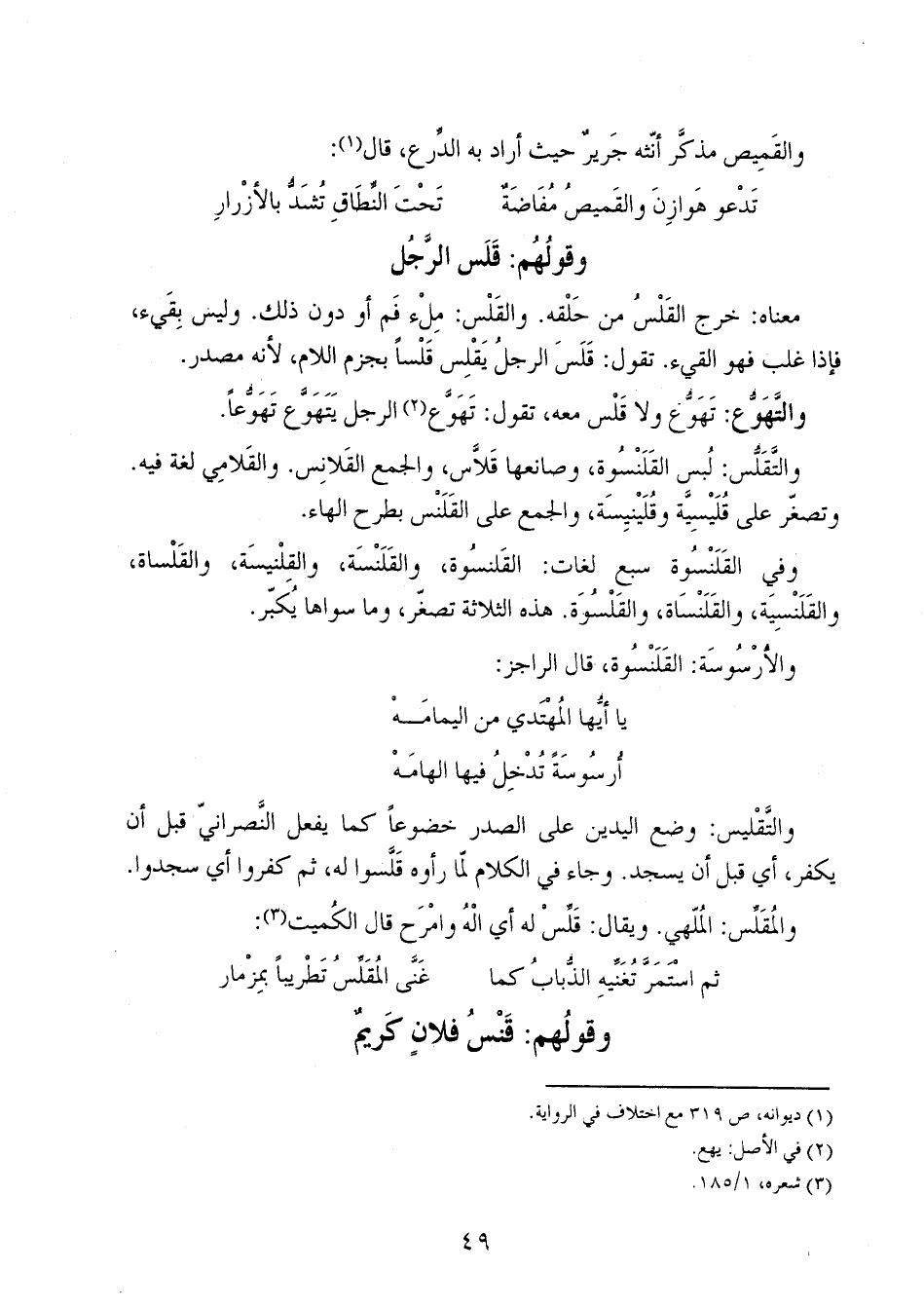 وفي القَلَنسوة سبع لغات: القلنسوة، والقلنسة، والقلنيسة، والقلساة، والقَلَنْسية، والقلنساة، والقلسوة. هذه الثلاثة تصغّر، وما سواها يُكبّر.