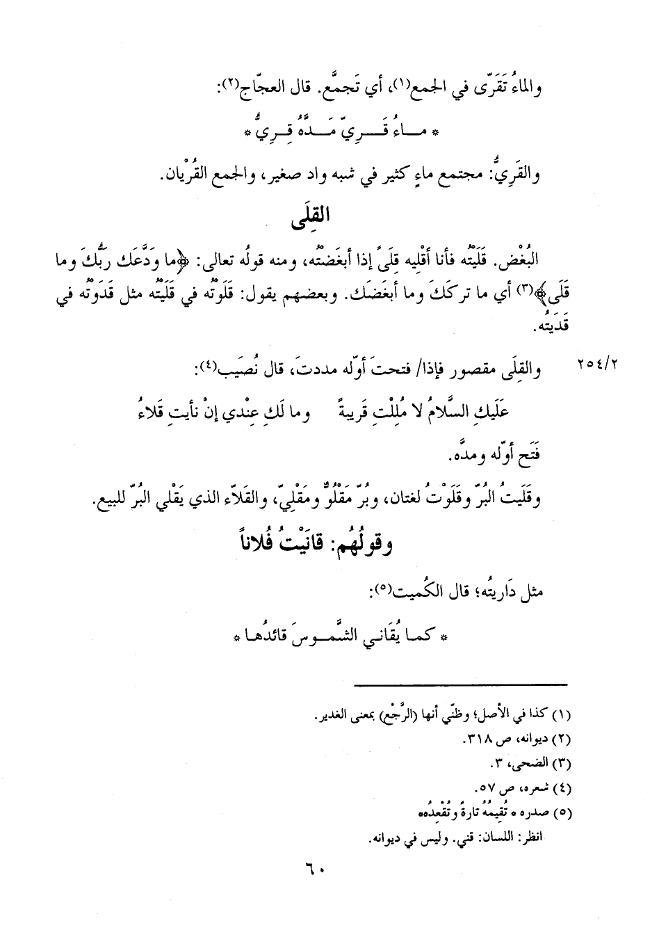 البُغض. قليته فأنا أقليه قلى إذا أبغضته، ومنه قوله تعالى: {مَا وَدَّعَكَ رَبُّكَ وَمَا قَلَى} أي ما تركك وما أبغضك. وبعضهم يقولأ: قلوته في قليته مثل قدوته في قديته.
