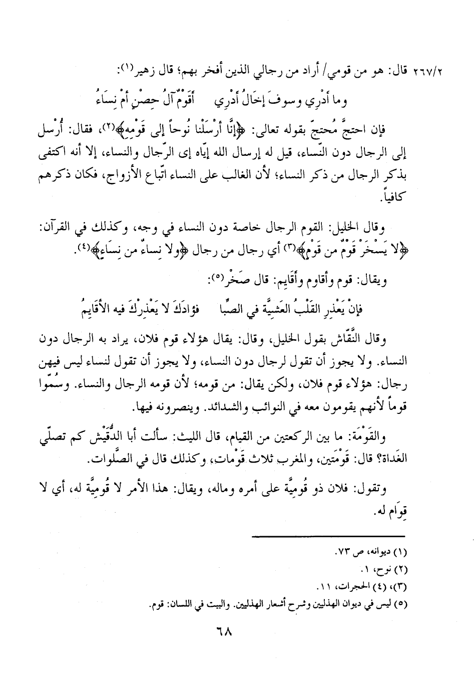 وقال الخليل: القوم الرجال خاصة دون النساء في وجه، وكذلك في القرآن: {لا يَسْخَرْ قَومٌ مِنْ قَوْمٍ} أي رجال من رجال {وَلا نِسَاءٌ مِنْ نِسَاءٍ}.