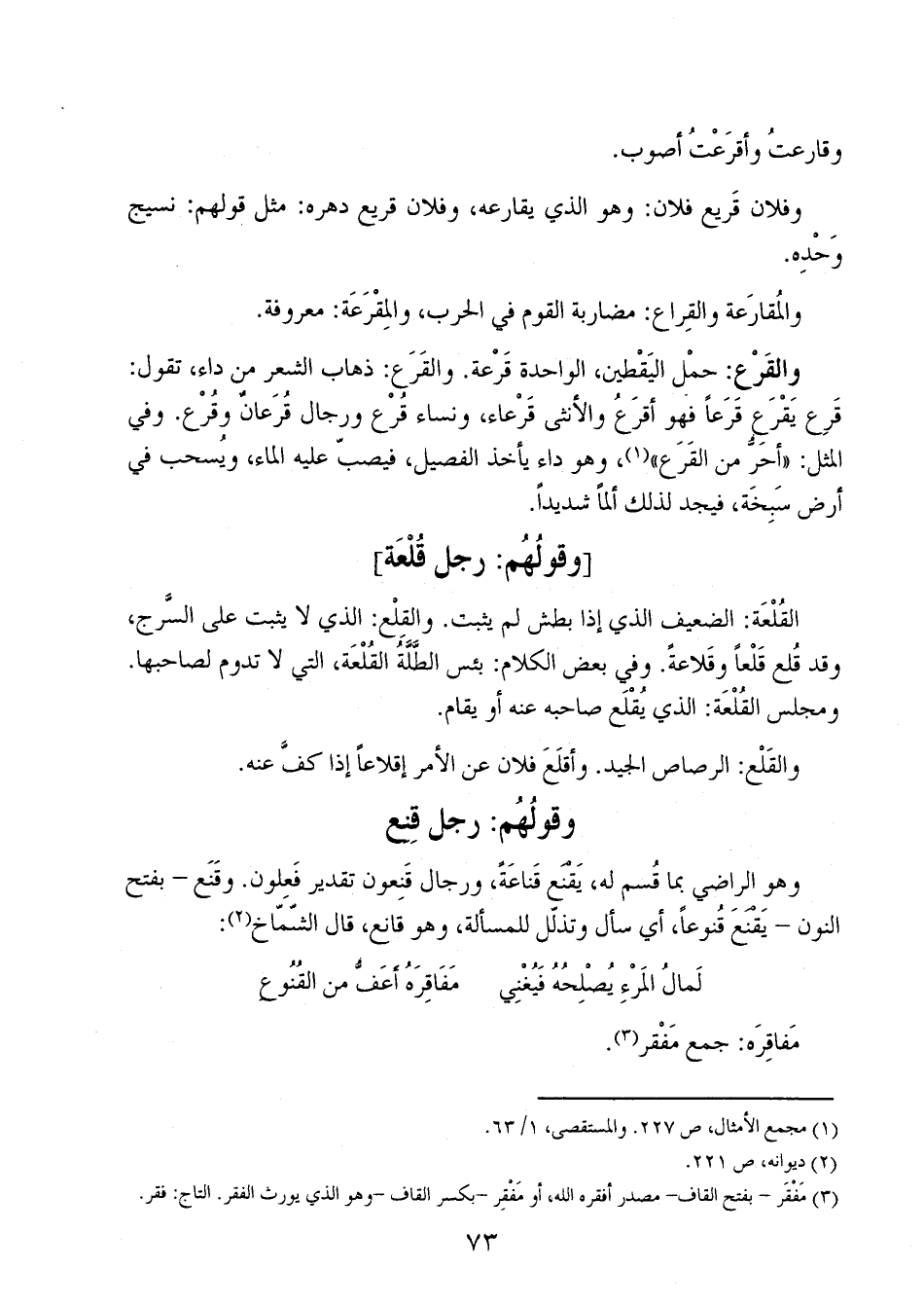 وهو الراضي بما قُسم له، يقنع قناعة، ورجال قَنِعون تقدير فعلون. وقَنَع- بفتح النون- يقنع قنوعاً، أي سأل وتذلل للمسألة، وهو قانع، قال الشماخ: