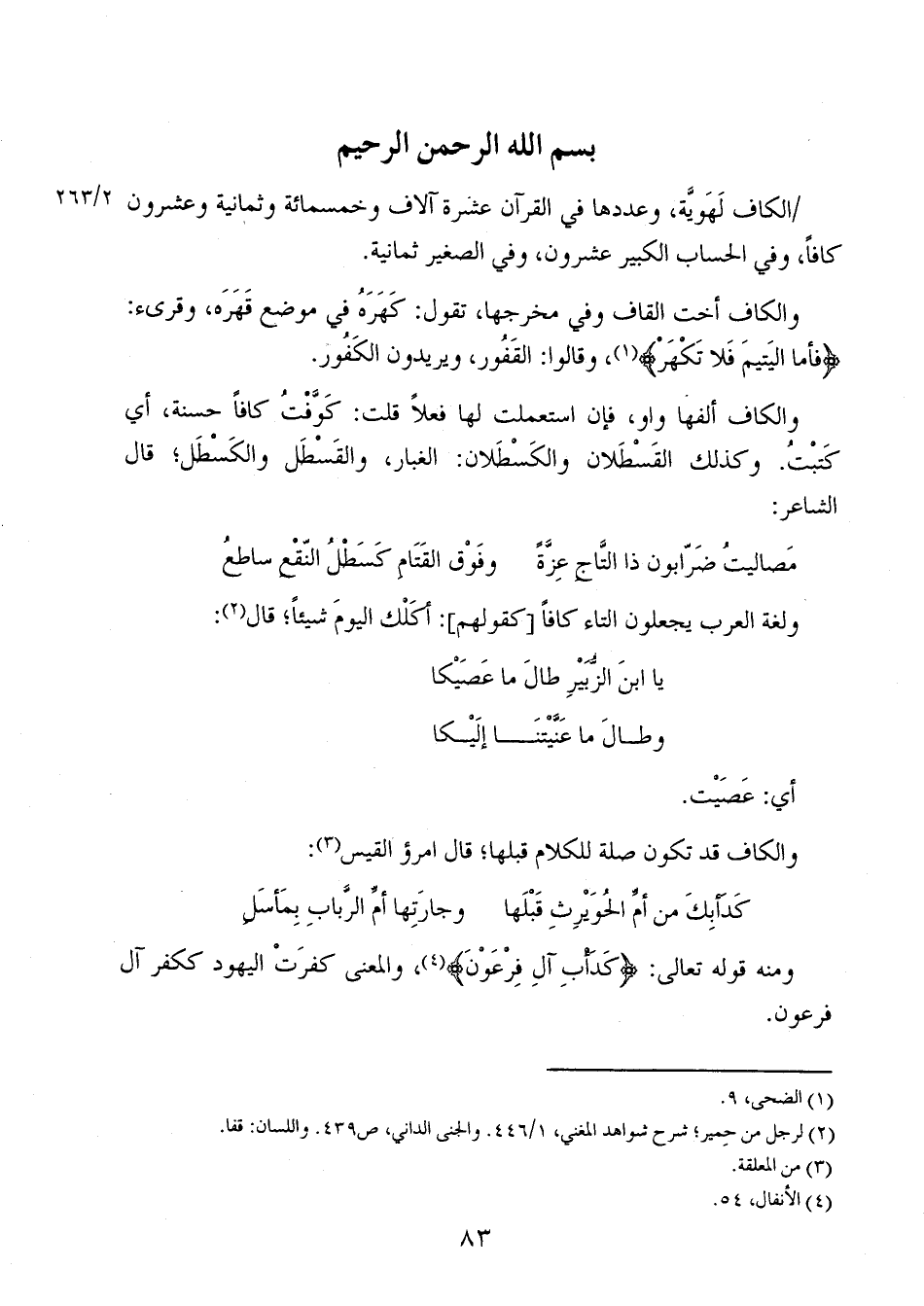 الكاف لهوية، وعددها في القرآن عشرة آلاف وخمسمائة وثمانية وعشرون كافاً، وفي الحساب الكبير عشرون، وفي الصغير ثمانية.