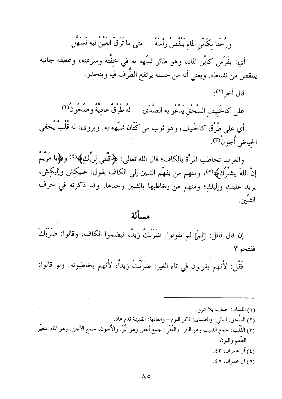 والعرب تخاطب المرأة بالكاف؛ قال الله تعالى: {اقْنُتِي لِرَبِّكِ} و {يَا مَرْيَمُ إِنَّ اللَّهَ يُبَشِّرُكِ}، ومنهم من يفهم الشين إلى الكاف يقول: عليكش وإليكش، يريد عليك وإليك؛ ومنهم من يخاطبها بالشين وحدها. وقد ذكرته في حرف الشين.