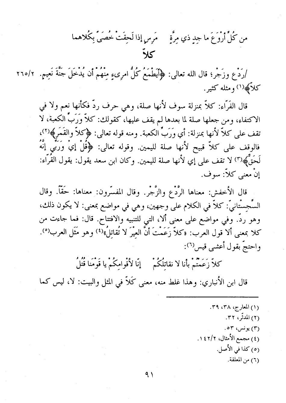 قال الأخفض: معناها الرَّدع والزَّجْر. وقال المفسرون: معناها: حقاً. وقال السجستاني: كلا في الكلام على وجهين، وهي في مواضع بمعنى: لا يكون ذلك، وهو رد. وفي مواضع على معنى ألا، التي للتنبيه والافتتاح. قال: فما جاءت من كلا بمعنى ألا قول العرب: "كلّا زعمت أن العير لا تُقاتل" وهو مثل العرب. واحتج بقول أعشى قيس: