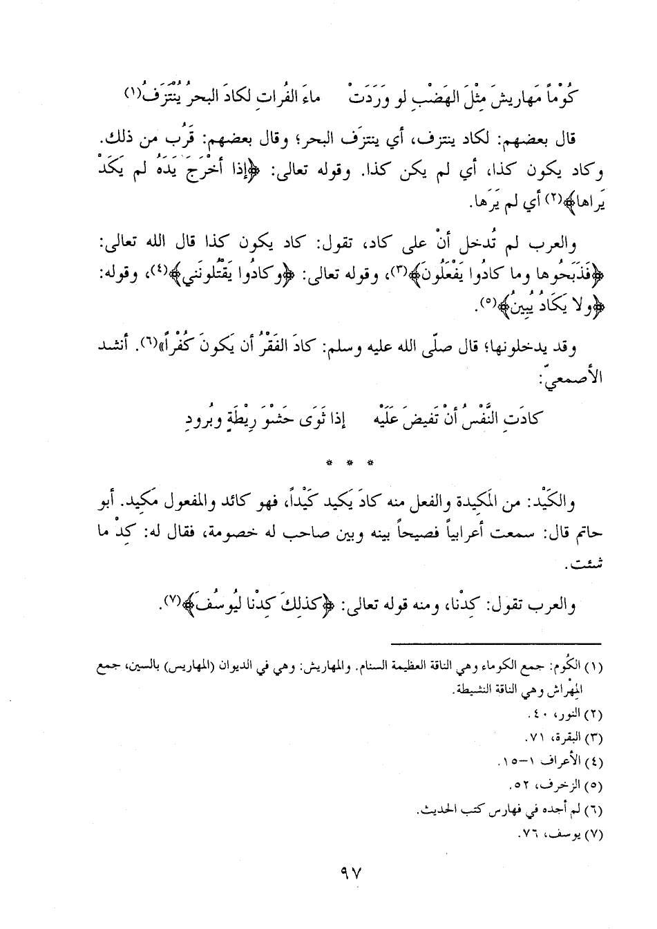 والعرب لم تدخل أن على كاد، تقول: كاد يكون كذا قال الله تعالى: {فَذَبَحُوهَا وَمَا كَادُوا يَفْعَلُونَ}، وقوله تعالى: {وَكَادُوا يَقْتُلُونَنِي}، وقوله: {وَلا يَكَادُ يُبِينُ}.