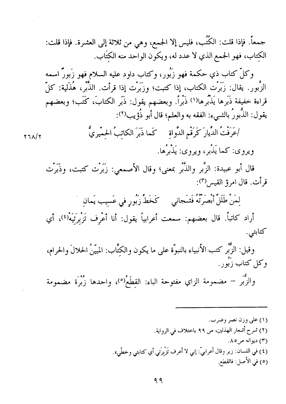 وكل كتاب ذي حكمة فهو زَبُور، وكتاب داود عليه السلام فهو زبور اسمه الزَّبور. يقال: زَبَرت الكتاب، إذا كتبت؛ وزَبَرْت إذا قرأت. الذبْر، هُذَلية: كل قراءة خفيفة ذبرها يذبرها ذَبْراً. وبعضهم يقول: ذَبَر الكتاب، كَتَب؛ وبعضهم يقول: الذُّبور بالشيء: الفقه به والعلم؛ قال أبو ذؤيب: