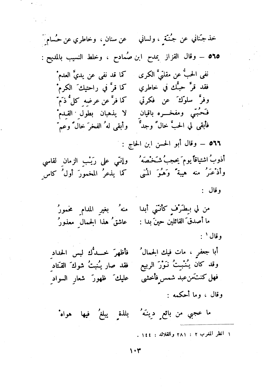 خذ جناني عن جنةٍ، ولسلني ... عن سنانٍ، وخاطري عن حسام 565 - وقال القزاز يمدح ابن صمادح، وخلط النسيب بالمديح: