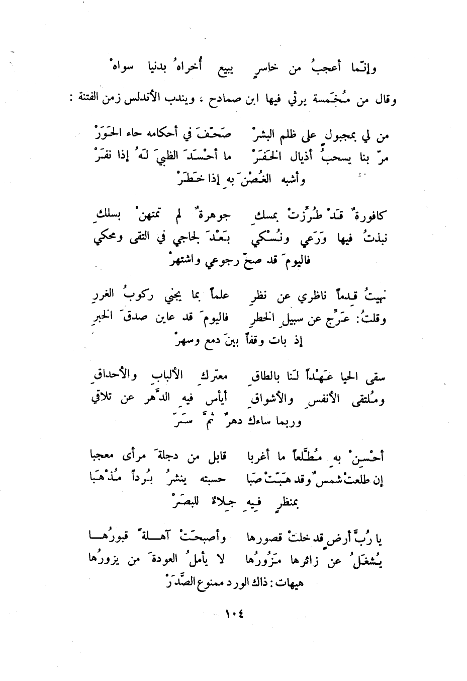 وإنما أعجب من خاسرٍ ... يبيع أخراه بدنيا سواه وقال في مخمسة يرثي فيها ابن صمادح، ويندب الأندلس زمن الفتنة: