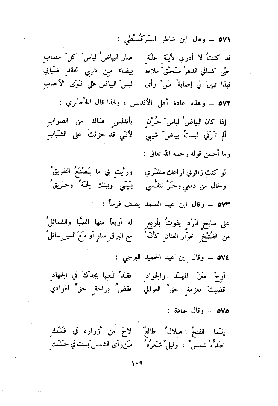 فبذا تبين لي إصابة من رأى ... لبس الباض على نوى الأحباب 572 - وهذه عادة أهل الأندلس، ولهذا قال الحصري: