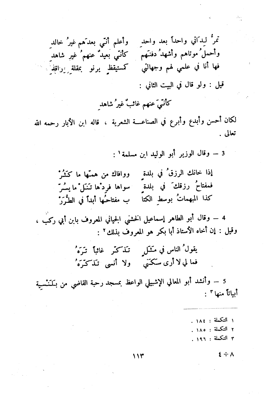 فما لي لا أرى سكني ... ولا أنسى تذكره 5 - وأنشد أبو المعالي الإشبيلي الواعظ بمسجد رحبة القاضي من بلنسية أبياتاً منها (3) :