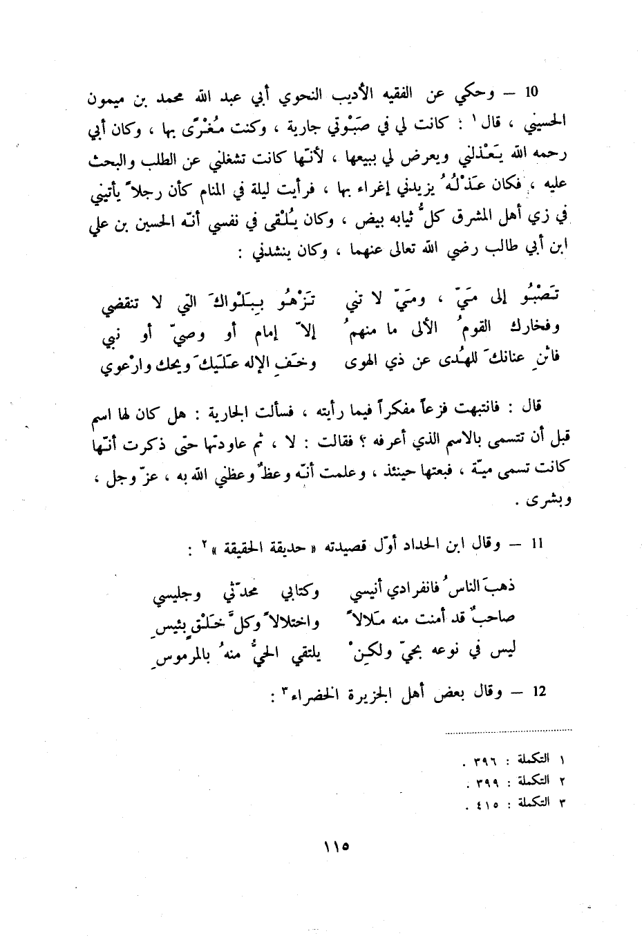 10 - وحكي عن الفقيه الأديب النحوي أبي عبد الله محمد بن ميمون الحسيني، قال (1) : كانت لي في صبوتي جاريةً، وكنت مغرىً بها، وكان أبي رحمه الله يعذلني ويعرض لي بيعها، لأنها كانت تشغلني عن الطلب والبحث عليه، فكان عذله يزيدني إغراء بها، فرأيت ليلةً في المنام كأن رجلاً يأتيني في زي أهل المشرق كل ثيابه بيض، وكان يلقى في نفسي أنه الحسين بن علي ابن أبي طالب رضي الله تعالى عنهما، وكان ينشدني: