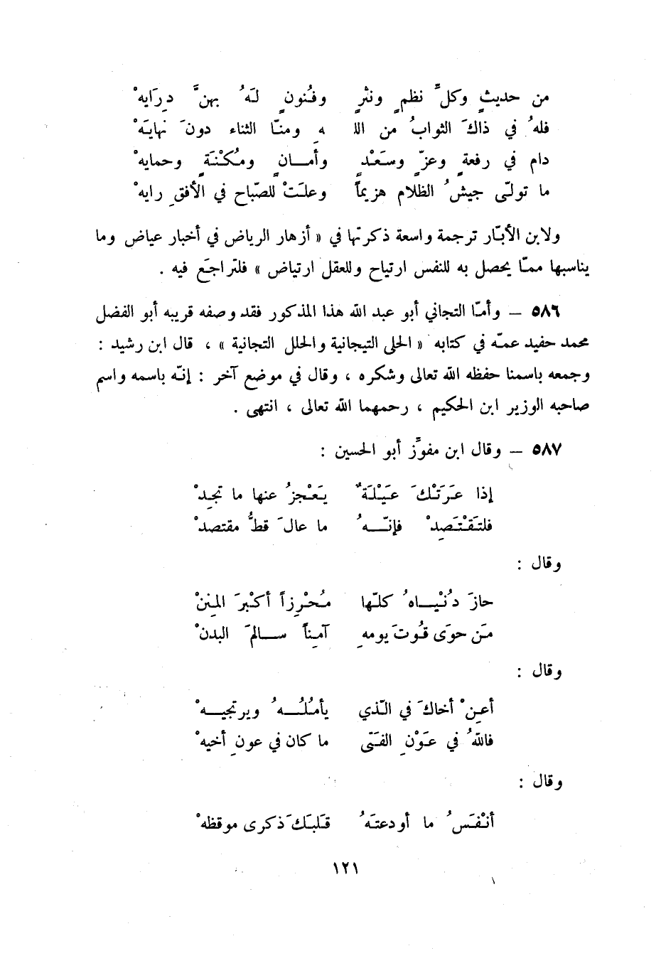 586 - وأما التجاني أبو عبد الله هذا المذكور فقد وصفه قريبه أبو الفضل محمد حفيد عمه في كتابه الحلى التيجانية والحلل التيجانية، قال ابن رشيد: وجمعه باسمنا حفظه الله تعالى وشكره، وقال في موضع آخر: إنه باسمه واسم صاحبه الوزير ابن الحكيم، رحمهما الله تعالى، انتهى.