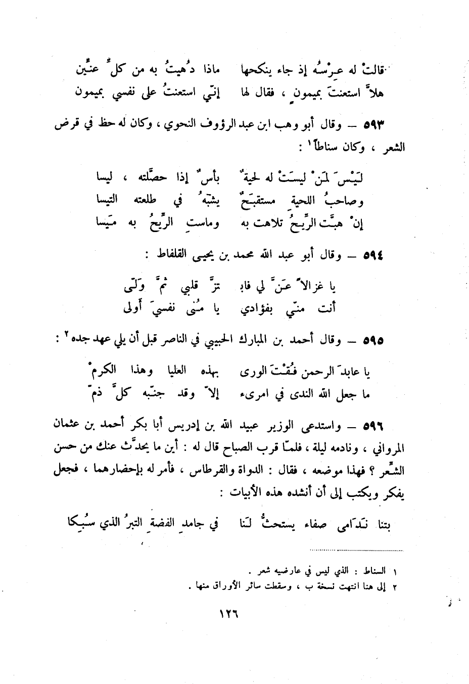 593 - وقال أبو وهب ابن عبد الرؤوف النحوي، وكان له حظ في قرض الشعر، وكان سناطاً (1) :