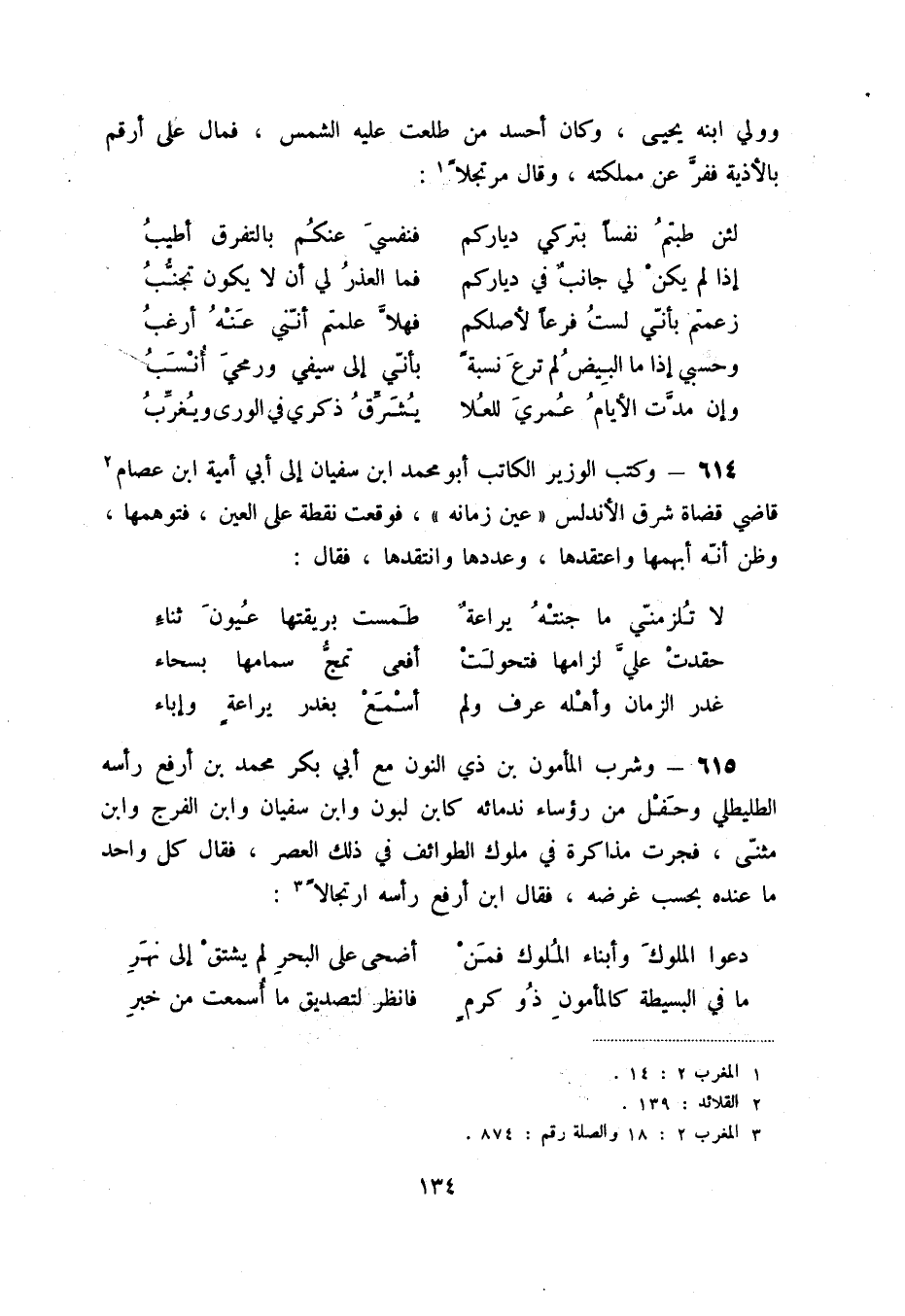 615 - وشرب المأمون بن ذي النون مع أبي بكر محمد بن أرفع رأسه الطليطلي وحفل من رؤساء ندمائه كابن لبون وابن سفيان وابن الفرج وابن مثنى، فجرت مذاكرة في ملوك الطوائف في ذلك العصر، فقال كل واحد ما عنده بحسب غرضه، فقال ابن أرفع رأسه ارتجالاً (3) :
