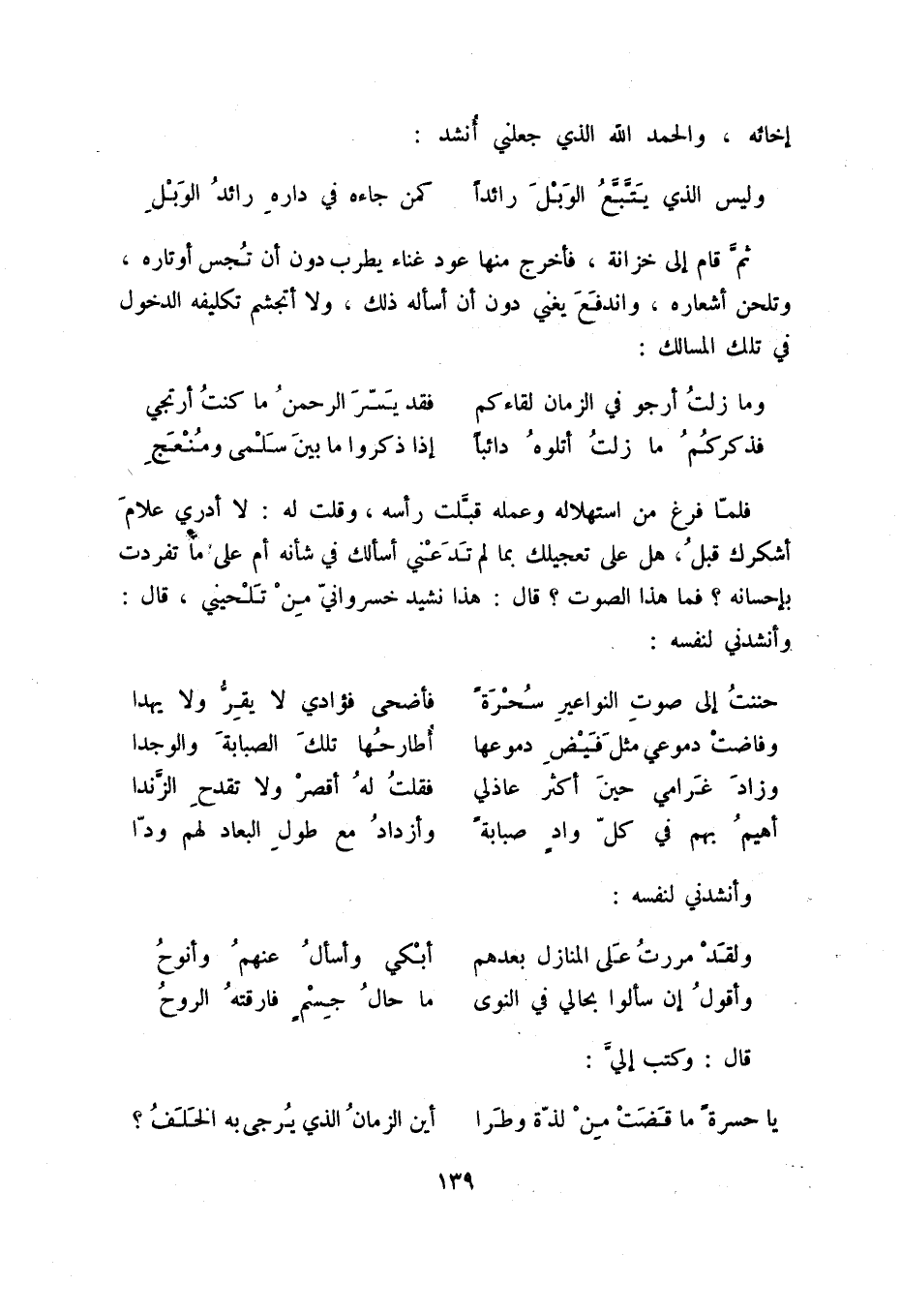 فلما فرغ من استهلاله وعمله قبلت رأسه، وقلت له: لا أدري علام أشكرك قبل، هل على تعجيلك بما لم تدعني أسألك في شأنه أم على ما تفردت في إحسانه فما هذا الصوت قال: هذا نشيد خسرواني من تلحيني، قال: وأنشدني لنفسه: