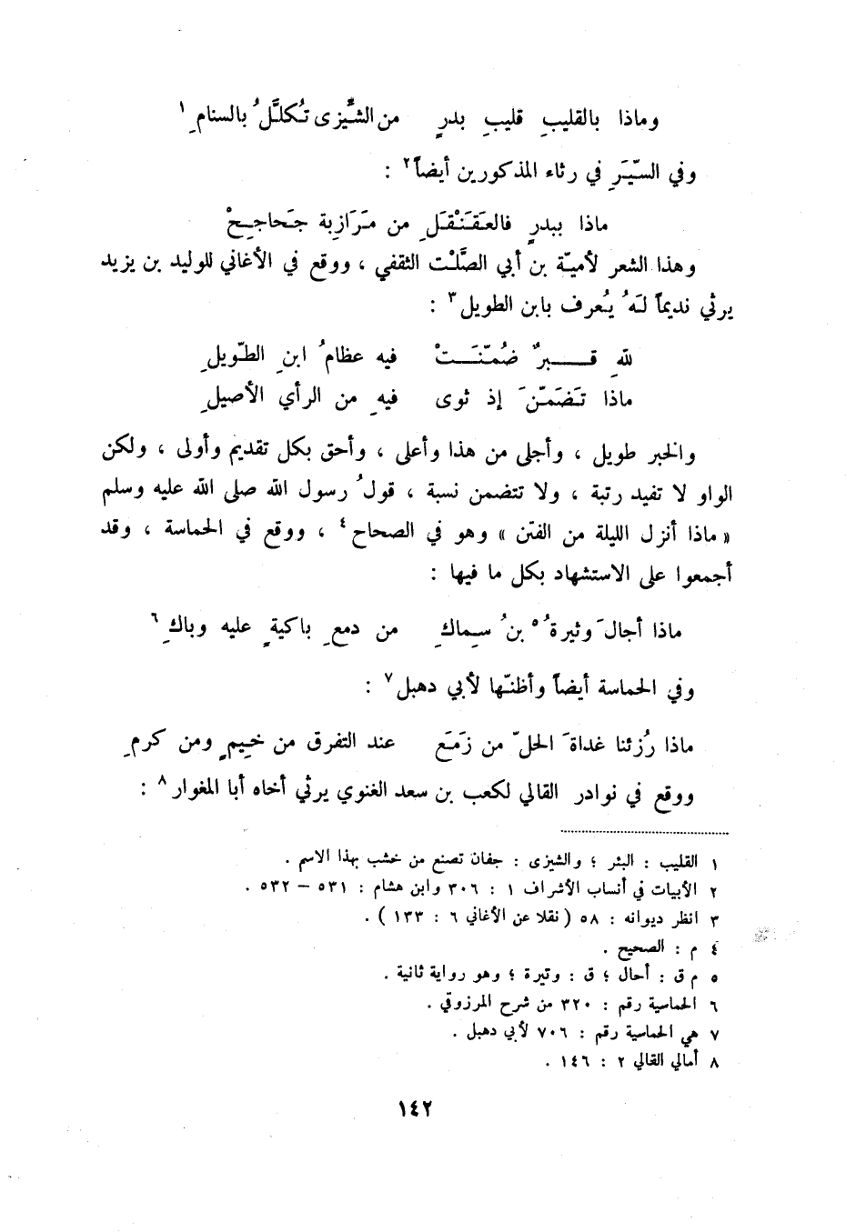 وماذا بالقليب قليب بدر ... من الشيزى تكلل بالسنام (1) وفي السير في رثاء المذكورين أيضاً (2) :