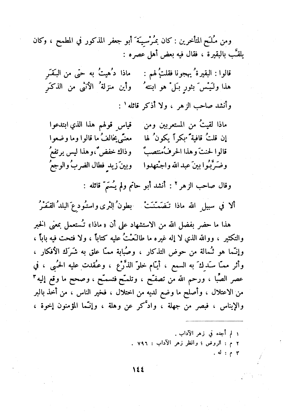 هذا ما حضر بفضل الله من الاستشهاد على أن ماذا تستعمل بمعنى الخبر والتكثير، ووالله الذي لا إله غيره ما طالعت عليه كتاباً، ولا فتحت فيه باباً، وإنما هو ثمالة من حوض التدكار، وصبابة مما علق به شرك الأفكار، وأثر مما سدك به السمع، أيام خلو الذرع، وعقدت علي الحبى، في عصر الصبا، ورحم الله من تصفح، وتلمح فتسمح، وصحح ما وقع إليه (3) من الاعتلال، وأصلح ما وضع لديه من اختلال، فخير الناس، من أخذ بالبر والإيناس، فبصر من جهلة، وادكر عن وهلة، وإنما المؤمنون إخوة،