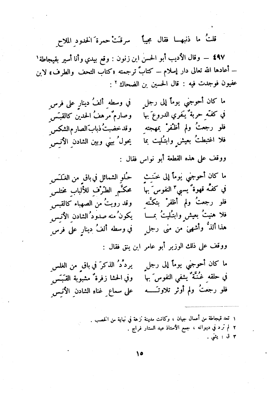 قلت ما ذنبها فقال مجيباً ... سرقت حمرة الخدود الملاح 497 - وقال الأديب أبو الحسن ابن زنون: وقع بيدي وأنا أسير بقيجاطة (1) - أعادها الله تعالى دار إسلام - كتابٌ ترجمته " كتاب التحف والطرف " لابن عفيون فوجدت فيه: قال الحسين بن الضحاك (2) :