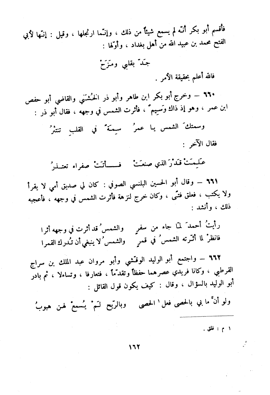 662 - واجتمع أبو الوليد الوقشي وأبو مروان عبد الملك بن سراج القرطبي، وكانا فريدي عصرهما حفظاً وتقدماً، فتعارفا، وتساءلا، ثم بادر أبو الوليد بالسؤال، وقال: كيف يكون قول القائل: