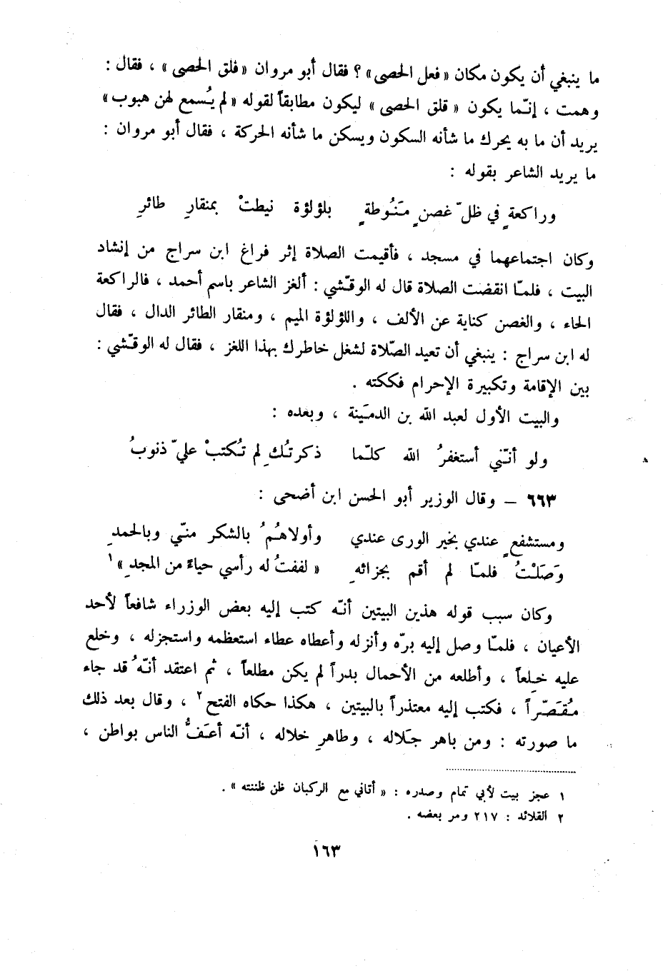 ما ينبغي أن يكون مكان فعل الحصى فقال أبو مروان فلق الحصى، فقال: وهمت، إنما يكون قلق الحصى ليكون مطابقاً لقوله لم يسمع لهن هبوب يريد أن ما به يحرك ما شأنه السكون ويسكن ما شانه الحركة، فقال أبو مروان: ما يريد الشاعر بقوله: