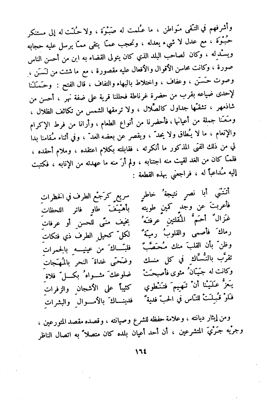 أشرفهم في التقى مواطن، ما علمت له صبوة، ولا حلت له إلى مستنكر حبوة، مع عدل لا شيء يعدله، وتحجب عما يتقى مما يرسل عليه حجابه ويسدله، وكان لصاحب البلد الذي كان يتولى القضاء به ابن من أحسن الناس صورة، وكانت محاسن الأقوال والأفعال عليه مقصورة، مع ما شئت من لسن، وصوت حسن، وعفاف، واختلاط بالبهاء والتفاف، قال الفتح: وحملنا لإحدى ضياعه بقرب من حضرة غرناطة فحللنا قرية على ضفة نهر، أحسن من شاذ مهر، تشقها جداول كالصلال، ولا ترمقها الشمس من تكاثف الظلال، ومعنا جملة من أعيانها، فأحضرنا من أنواع الطعام، وأرانا من فرط الإكرام والإنعام، ما لا يطاق ولا يحد، ويقصر عن بعضه العد، وفي أثناء مقامنا بدا لي من ذلك الفتى المذكور ما أنكرته، فقابلته بكلام أعتقده، وملام أحقده، فلما كان من الغد لقيت منه اجتناب، ولم أر منه ما عهدته من الإنابة، فكتبت إليه مداعباً له، فراجعني بهذه القطعة: