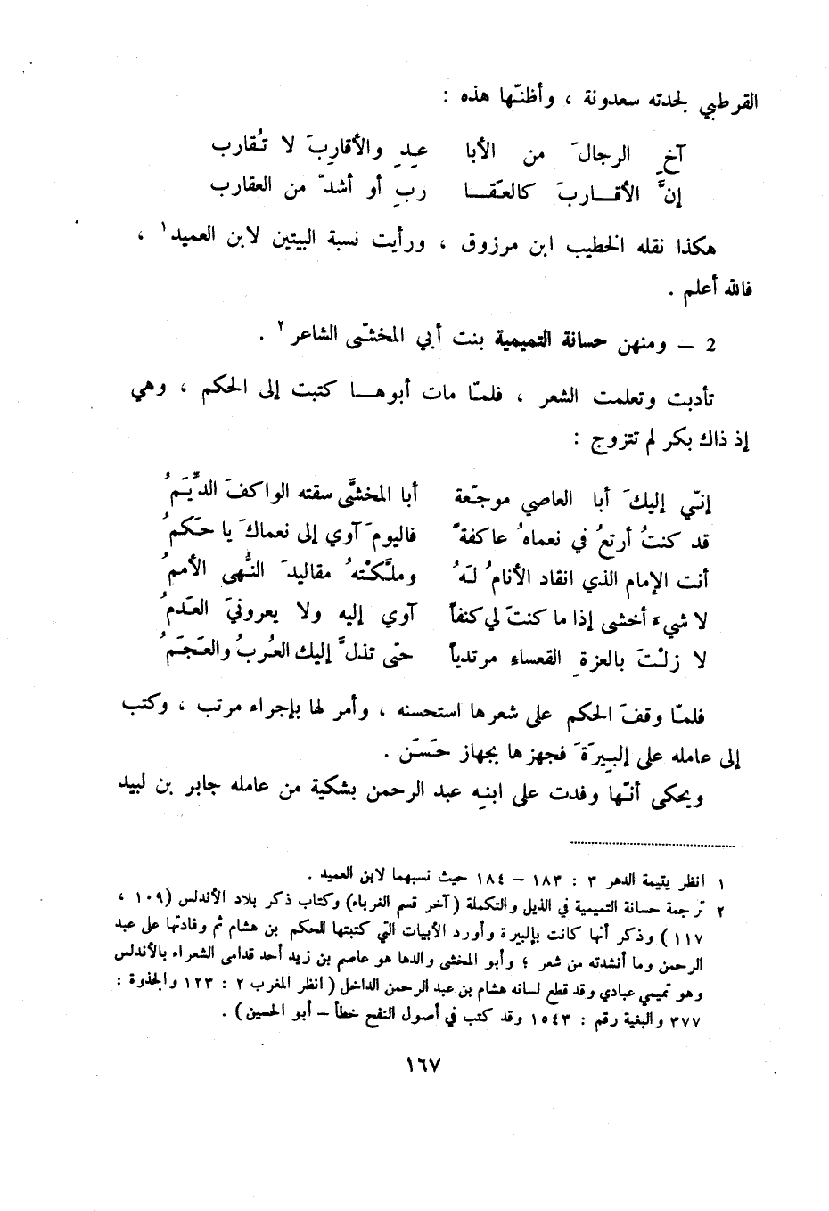 (2) ترجمة حسانة التيمية في الذيل والتكملة (آخر قسم الغرباء) وكتاب ذكر بلاد الأندلس (109، 117) وذكر أنها كانت بإلبيرة وأورد الأبيات التي كتبتها للحكم بن هشام ثم وفادتها على عبد الرحمن وما أنشدته من شعر؛ وأبو المخشي والدها هو عاصم بن زيد أحد قدامى الشعراء بالأندلس وهو تميمي عبادي وقد قطع لسانه هشام بن عبد الرحمن الداخل (انظر المغرب 2: 123 والجذوة: 377 والبغية رقم: 1543 وقد كتب في أصول النفح خطأ - أبو الحسين) .