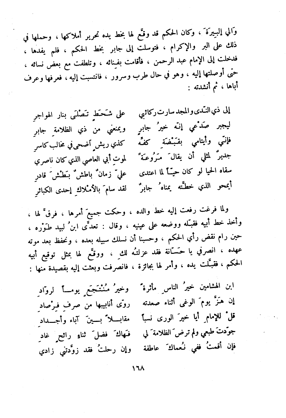 والي إلبيرة، وكان الحكم قد وقع لها بخط يده تحرير أملاكها، وحملها في ذلك على البر والإكرام، فتوسلت إلى جابر بخط الحكم، فلم يفدها، فدخلت إلى الإمام عبد الرحمن، فأقامت بفنائه، وتلطفت مع بعض نسائه، حتى أوصلتها إليه، وهو في حالة طرب وسرور، فانتسبت إليه، فعرفها وعرف أباها، ثم أنشدته:
