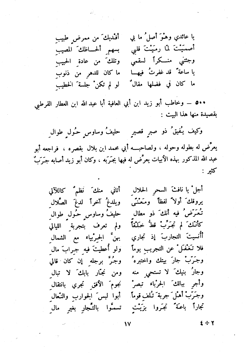 ما كان في فضلها مقالٌ ... لو لم تكن جلسة الخطيب 500 - وخاطب أبو زيد ابن أبي العافية أبا عبد الله ابن العطار القرطبي بقصيدة منها هذا البيت: