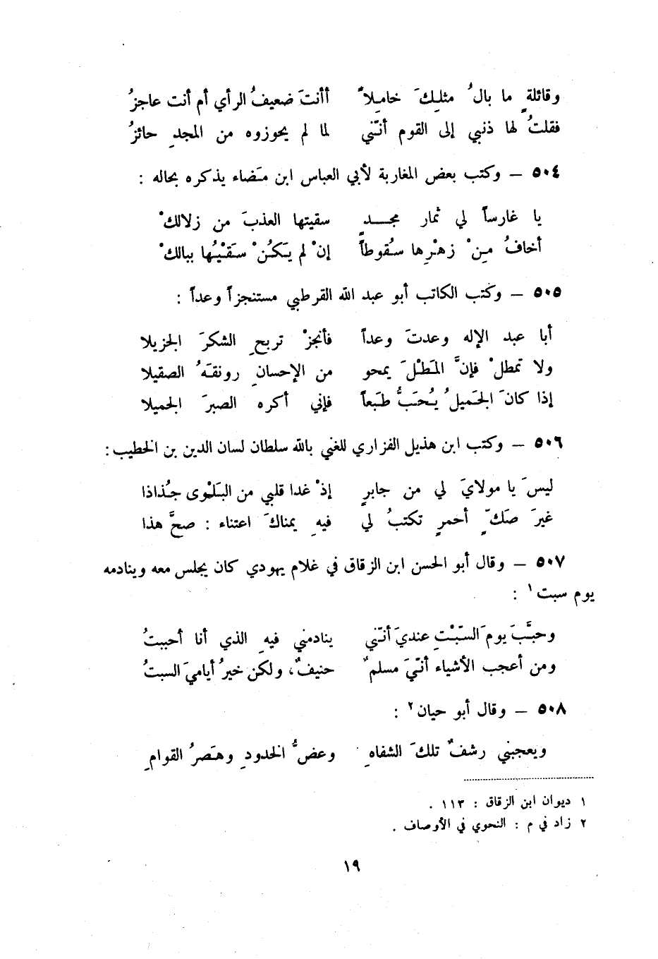 غير صكٍّ أحمرٍ تكتب لي ... فيه يمناك اعتناءً: صحَّ هذا 507 - وقال أبو الحسن ابن الزقاق في غلام يهودي كان يجلس معه وينادمه يوم سبت (1) :