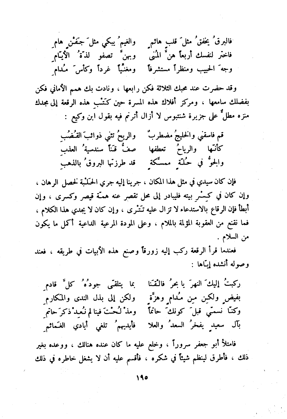 وقد حضرت عند محبك الثلاثة فكن رابعها، ونادت بك همم الأماني فكن بفضلك سامعها، ومركز أفلاك هذه المسرة حين كتب هذه الرقعة إلى مجدك منزه مطل على جزيرة شنتبوس لا زال أترنم فيه بقول ابن وكيع: