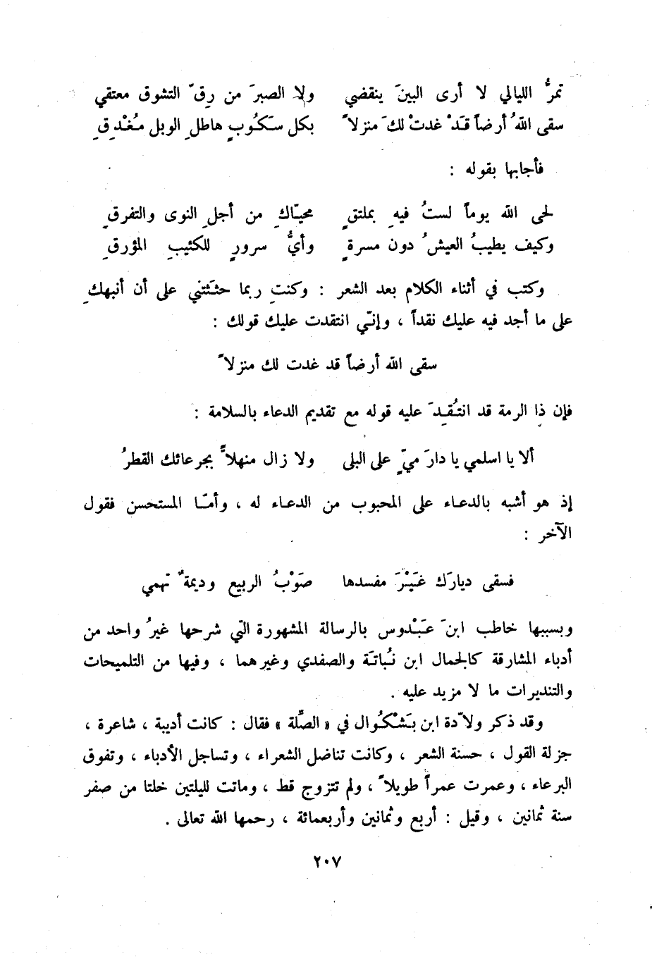 وقد ذكر ولادة ابن بشكوال في الصلة فقال: كانت أديبة، شاعرة، جزلة القول، حسنة الشعر، وكانت تناضل الشعراء، وتساجل الأدباء، وتفوق البرعاء، وعمرت عمراً طويلاً، ولم تتزوج قط، وماتت لليلتين خلتا من صفر سنة ثمانين، وقيل: أربع وثمانين وأربعمائة، رحمها الله تعالى.