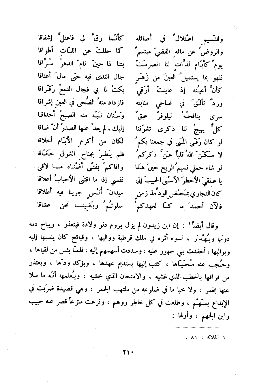 وقال أيضاً (1) : أن ابن زيدون لم يزل يروم دنو ولادة فيعتذر، ويباح دمه دونها ويهدر، لسوء أثره في ملك قرطبة وواليها، وقبائح كان ينسبها إليه ويواليها، أحقدت بني جهور عليه، وسددت أسهمهم إليه، فلما يئس من لقياها، وحجب عنه محياها، كتب إليها يستديم عهدها، ويؤكد ودها، ويعتذر من فراقها بالخطب الذي غشيه، ويعلمها أنه ما سلا عنها بخمر، ولا خبى ما في ضلوعه من ملتهب الجمر، وهي قصيدة ضربت في الإبداع بسهم، وطلعت في كل خاطر ووهم، ونزعت منزعاً قصر عنه حبيب وابن الجهم، وأولها: