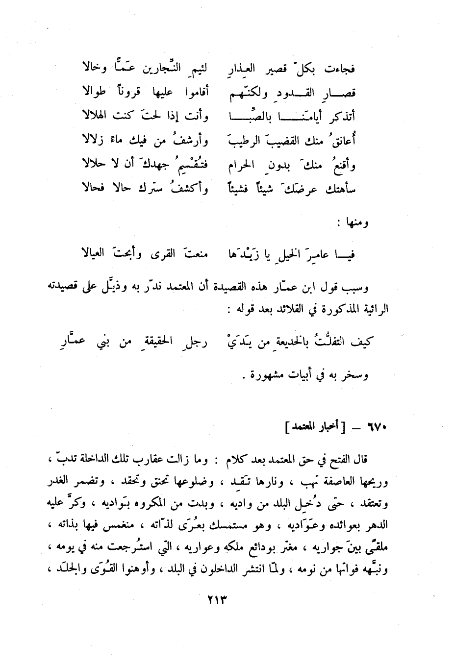 قال الفتح في حق المعتمد بعد كلام: وما زالت تلك الداخلة تدب، وريحها العاصفة تهب، ونارها تقد، وضلوعها تحنق وتحقد، وتضمر الغدر وتعتقد، حتى دخل البلد من واديه، وبدت من المكروه بواديه، وكر عليه الدهر بعوائده وعواديه، وهو مستمسك بعرى لذاته، منغمس فيها بذاته، ملقى بين جواريه، مغتر بودائع ملكه وعواريه، التي استرجعت منه في يومه، ونبهه فواتها من نومه، ولما انتشر الداخلون في البلد، وأوهنوا القوى والجلد